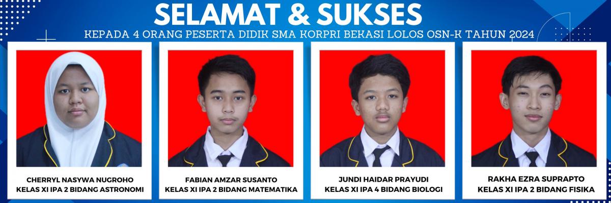 Bekasi, 23 April 2024 - Kabar membanggakan datang dari SMA KORPRI Bekasi. Empat peserta didiknya berhasil lolos seleksi Olimpiade Sains Nasional (OSN) Tingkat Kota Bekasi Tahun 2024. Keempat siswa tersebut adalah:
